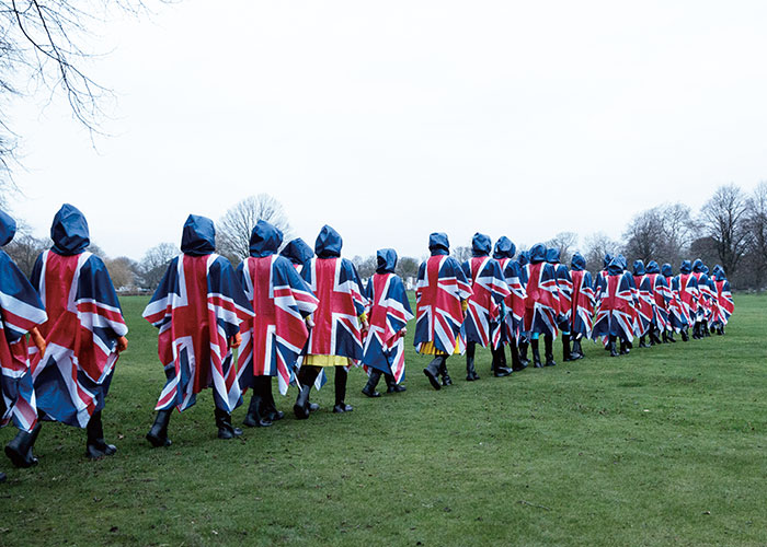 遠い星から来た人々に関しては、パウエルは「サブカルに見えつつ、魅力的な若者のグループである必要があった」と語る。彼らがエリザベス女王即位25周年の式典に、本物そっくりのユニオン・ジャックの雨用ポンチョを着てうまく溶け込もうと試みるのも、彼女ならではの天才的発想だ。彼らのツルツルのラテックス製の衣装を着るには、「ふたりに手伝ってもらう必要があったわ」とファニングは笑う。「ローションを塗ってするっと簡単に着られるように。おおごとだったわ」。