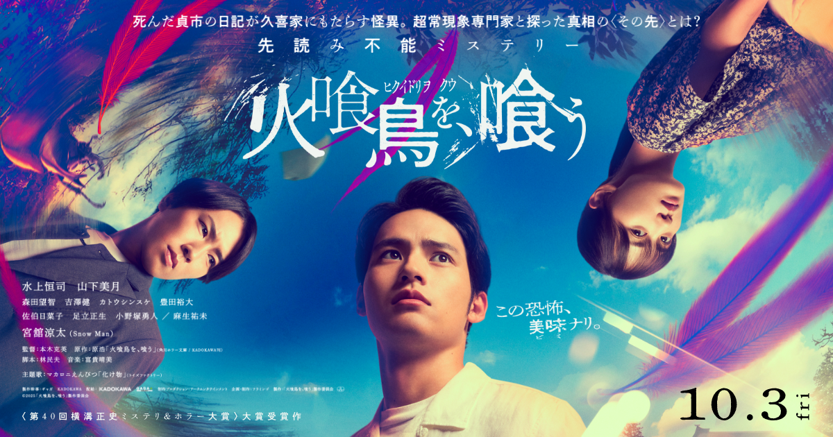 10月10日(金)に台湾で開幕した第25回高雄映画祭にて『火喰鳥を、喰う』が上映され、主演の水上恒司が現地を訪問! 10日に行われたオープニングセレモニーでは、本作『火喰鳥を、喰う』と『九龍ジェネリックロマンス』という2作の主演映画を携えてレッドカーペットを歩き、翌11日に行われた記者会見、上映前の舞台挨拶、上映後の観客とのQ&Aにも出席し、現地ファンから大きな歓声を浴びた。 記者会見では、本作への出演について、様々な怪奇な事件に遭遇する主人公を演じることで“受け”の芝居を求められることが多くなる点に言及し「この雄司役をやることで、受け身の引き出しを新たに模索する良いチャンスだなと思いました。また、これまでミステリー映画に出るということがなかったので、そこに身を投じて、どういう作品にできるか? ということを楽しみにこの作品に向き合っていきました」とふり返った。また、Q&Aで台湾の観客と直接触れ合えたことが水上にとっても刺激的な経験になったようで、「現代においてSNSというものを介さないと、ファンの方と交わることがなかなかないので、(普段は観客の)意見などを聴くのがそこ(SNS)が主流になっていきます。それが(映画祭では)舞台挨拶やQ&Aで直接、意見、質問、感性や価値観を聴ける。そういう方々の意見を聞いて、それを取り入れて、次の作品や芝居に反映していくという作り方が僕の中ではしっくりくるので、Q & Aというのは僕は好きです」と改めてファンと直接触れ合い、その声に耳を傾けることの重要性と意義を語った。 本編上映後のQ&Aでは、観客から映画のオープニングシーンで登場する白い服の少女や鳥、ノート、そして不気味な笑みにはどんな意味があるのか?あれは現実なのか?それとも幻想なのか?と水上さんの解釈を求める質問が。水上さんは「(答えが)僕の中にも明確にあるわけではないです。明確に説明しなくていい、疑問に思ってもらえる存在やセリフ、アクションをどれだけ残せるかというのは、一役者として目指したいところでもあります。現代は、辻褄が合っている“わかりやすさ”を求められる時代だからこそ、こういうふうに遊びを持ってつくれることは憧れであったりします。僕の中では(オープニングのシーンは)単純に恐ろしさ、畏怖すべき存在です」と自身の考えを明かにした。 続いて、共演した山下のファンだという男性から、夫婦役で共演しての印象や尋ねられると「みなさんから見たら、僕も芸能界の人間かもしれませんが、その僕からしても、山下さんのアイドルとして、アーティストとして生きてこられた人生は、普通じゃないなと思います。ご自身の一挙手一投足、声や表情で目の前の方たちを魅了していくって相当なことだと思います。この映画では長野で生活している人間のところに東京から嫁いできた夕里子とダテさん(宮舘涼太)が演じた北斗のうさん臭さ――あの2人の持つ“異質さ”は、そういう(=アイドル、アーティストとして生きてきた)ところから出ているなと思ったし、すごく役に合っているなと思いました。自分の異質さを順応させようとする夕里子と、目的達成しようとする北斗というのをとても面白く見ていました」と改めて、山下と宮舘の異才ぶりを称賛。 他にも様々な質問に答えた水上は、最後に台湾の観客に感謝の意を述べ温かい拍手の中で舞台挨拶は幕を閉じた。