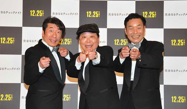 いよいよ今週金曜日から公開の映画「完全なるチェックメイト」ですが、今年結成30周年を迎えたダチョウ倶楽部さんを迎えて公開記念イベント行いました。 タキシード姿にチェス盤をイメージした白黒の蝶ネクタイを着用して、お決まりの掛け声『ヤ~!』で登場したダチョウ倶楽部さん。登壇するや否や持ちギャクの「どうぞどうぞ!」を披露するなど、一気に会場はダチョウワールドに。 『完全なるチェックメイト』を一足先に観賞したというダチョウ倶楽部の上島竜平さんは「天才ってやっぱりすごいんだな。手に汗に握りました!」 と熱弁、リーダーの肥後克広さんも「僕みたいにチェスのルールがわからなくても凄く面白く観られる作品!」と続き、最後に寺門ジモンさんは「国を背負った対決で、限界までプレシャーをかけられたら人間どうゆう行動を起こすのか?という部分もじっくり描かれていて竜ちゃんが追い込まれていく状況に似ていた。是非とも観てほしい」と本作を熱烈アピール。 今年結成30周年にちなんで、浮き沈みが激しい芸能界で長年一線でいられるコツを聞かれると「浮き沈みが激しいからダメなんです!我々は浮かないから!(笑)ずっと低いところで頑張ってます」と話し、すかさず「“我々は絶対浮かず現状維持!!”」と持ちギャクの“現状維持”を披露した。 本作が、世紀の一戦をかけた大勝負を描いた作品であることに、ダチョウ倶楽部が今年やった大勝負を聞かれると、「大勝負…ないね~…でも細かい勝負は毎回していますよ!今年になってまた新しいギャグを作るという勝負をしています!」と肥後さん。新ネタを2連発披露し、会場を大いに沸かせました。 今回、「そんなお前にチェックメイト!」という、隠れたギャグがあることが起用理由だと明かした上島さんは、同ネタについて「10年ほど前にちょっと使って封印したネタ。昔は「王手!」と叫ぶギャグだったんですが、有吉に「チェックメイト」の方が良いと言われ、有吉から3000円で買ったネタです(笑)」とギャグ誕生の秘話を明かしました。 「未だにこのギャグの使い方がいまいち分からない…。使う機会をいただけたことに感謝しています!」と語ると、 本日の締めにカメラに向って『12月25日より封切になります、「完全なるチェックメイト」…ご覧になるあなたのハートにチェックメイト!!』と今まで封印されていたギャグとので本作をPR! そこからは、チェック模様の服を着たカメラマンや記者陣に「そんなチェック柄のあなたにチェックメイト!」とネタを連発し、本作を熱烈にPRをするとともに、来年の流行語大賞はこのチェックメイトギャクで勝負すると宣言、30周年の記念すべき年の瀬に、来年の新たな本命ギャグの誕生(?)となり会場は大いに盛り上がりました。