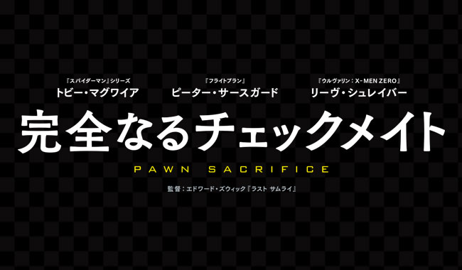 トビー・マグワイアと『ラスト サムライ』の監督が贈る、歴史を動かした〈チェス頂上決戦〉の真実12/25(金)公開「完全なるチェックメイト」(原題「Pawn Sacrifice」)公開決定! 米ソ冷戦時代、わずか15歳にして全米チャンピオンとなった実在の天才チェスプレイヤー、 ボビー・フィッシャーが、チェス最強国ソ連の絶対王者ボリス・スパスキーに挑んだ、 国家の威信をかけた世紀の一局。絶対不利と見られたフィッシャーが放った、 今なお語り継がれる〈神の一手〉の真実とは?ぜひお楽しみに!