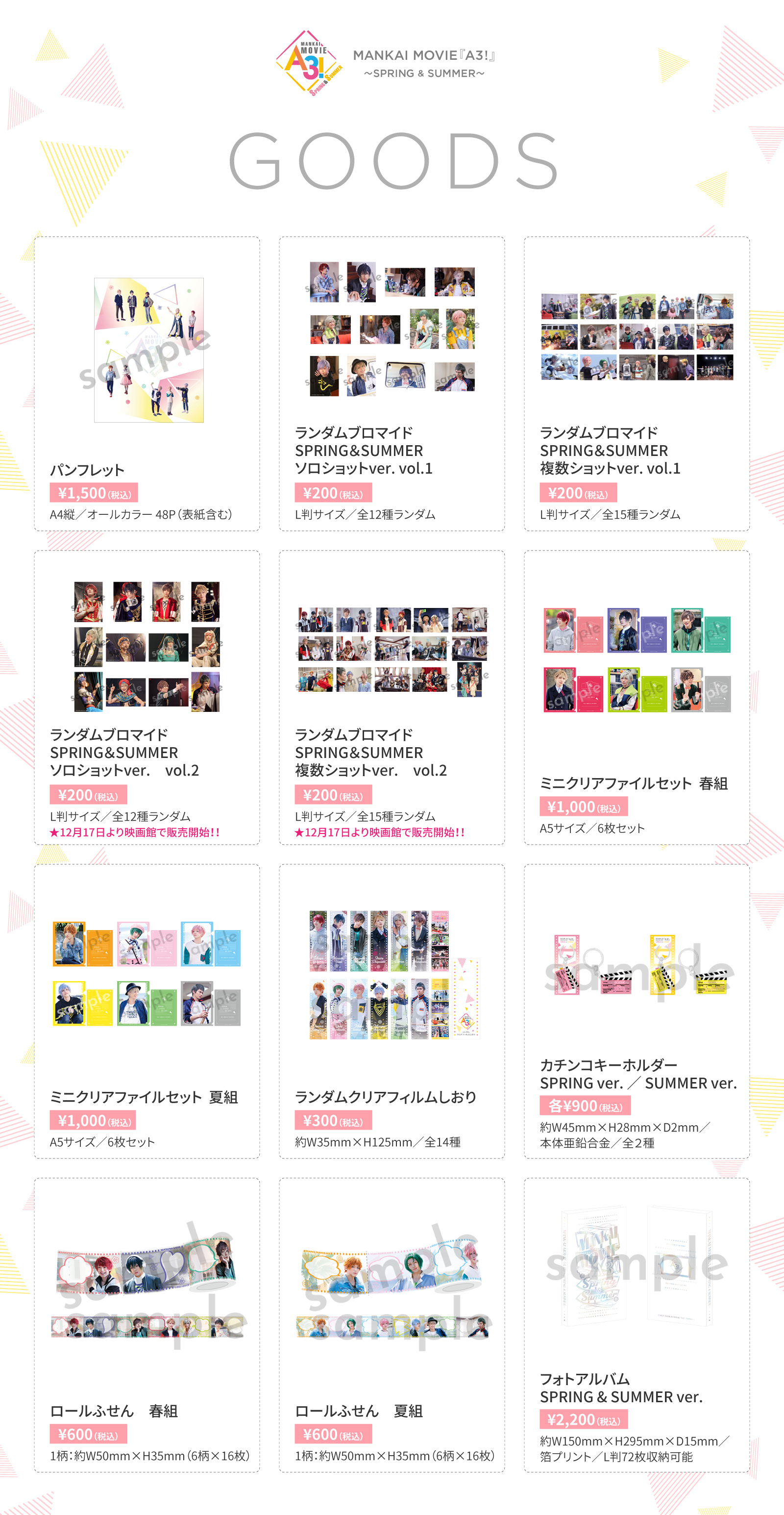 MANKAI MOVIE『A3!』のオフィシャルグッズにつきまして、11月30日(日)をもって一部商品の販売を終了させていただきます。 お買い逃しのないよう、この機会にぜひご利用ください。 ◆販売終了日 2025年11月30日(日)23:59 ご注文分まで ◆対象公演 MANKAI MOVIE『A3!』~SPRING & SUMMER~ MANKAI MOVIE『A3!』~AUTUMN & WINTER~ ※各パンフレット、およびBlu-ray・DVD各種につきましては継続販売いたします。 ◆取扱店舗 MANKAI STAGE『A3!』OFFICIAL FANCLUB ・きゃにめOFFICIAL ONLINE SHOP ・ネルケオンラインショップ ※海外向け販売も実施しております。It is available from all over the world. 詳細はこちら https://www.mankai-stage.jp/news/10399/ ※店舗によって入荷状況が異なります。商品によっては在庫がなくなり次第販売終了となりますのであらかじめご了承ください。 ※在庫や取扱商品等の詳細は各店舗までお問い合わせください。