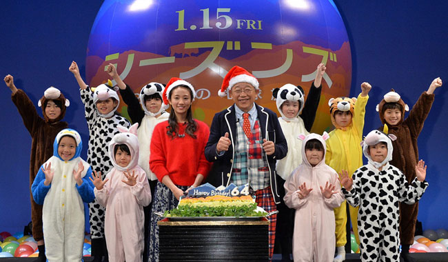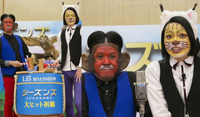 ■日程:12月23日(水) 15:00~■場所: イイノホール ■登壇者:笑福亭鶴瓶さん、木村文乃さんサンタ姿の木村文乃がアニマルキッズたちと鶴瓶の誕生日をサプライズでお祝い!!公開に先駆け、12月23日(水)『シーズンズ 2万年の地球旅行』の日本語版完成披露試写会を都内ホールで行いました。当日は、日本語版ナレーションを務めた笑福亭鶴瓶と木村文乃が舞台挨拶に登壇!会場内にスモークが立ち込め、レーザーライトに照らされた本作のオリジナル巨大バルーンが膨らんでいき会場が熱気に包まれる中で、2人はクリスマス直前にちなみサンタ帽をかぶり登場!!大きな歓声が沸き起こる中を、集まった多くの子供たちにはサンタボールをプレゼントしながら、また大人たちの声援にも笑顔や握手で答えながら客席内を歩いて舞台へ。 舞台上では、鶴瓶が「子供のオオカミがエサを遊びながら食べると、よく(人間でも)ある、お父さんが“遊ぶなら食べるな!”と怒ってエサを取り上げてしまうシーンが出てきて、人間と全く同じ行動でビックリ。おもしろいと思った」と本作の驚いたポイントについて語り、木村は「動物園や図鑑でしか見たことのなかった動物のありのままの姿を見れたり、毛の一本一本まで見えたり、息づかいまでもが聞こえてきそうな距離感で体感できる」と目を輝かせて本作の魅力を伝えた。 さらに、当日は鶴瓶の64回目の誕生日ということもあり、動物の着ぐるみを着たアニマルキッズたちが本作をイメージした色鮮やかなバースデーケーキとともに登場し、木村をはじめ観客らも一丸となってお祝いをするなど、盛り上がるイベントとなった。