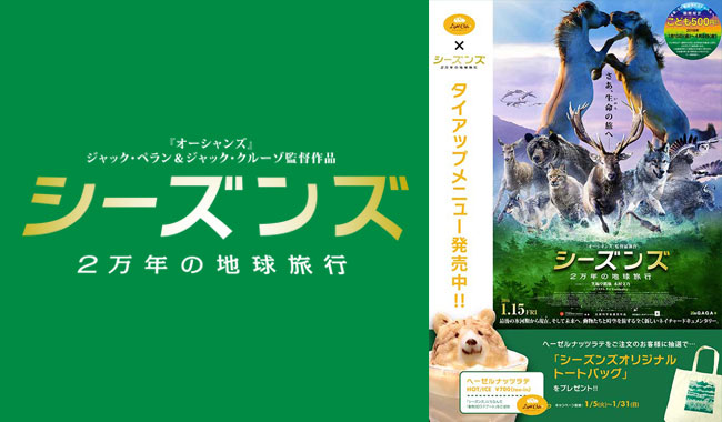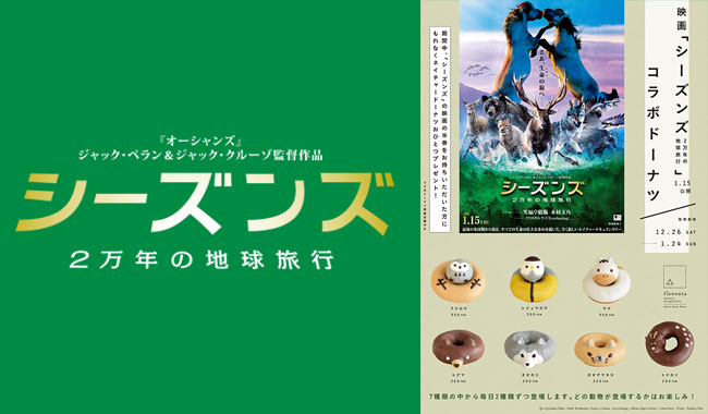 体にやさしくおいしいドーナツのお店でおなじみのフロレスタさんで『シーズンズ』に登場する動物たちがドーナツになりました。12月26日(土)~1月24日(日)までの期間限定で販売いたします。ぜひ、映画館でドーナツになった動物たちを探してみてください。さらに半券をお持ちいただくと『ネイチャードーナツ』のひとつがプレゼントに。※コラボドーナツ実施店舗のみ◎販売商品・フクロウ 300yen・シジュウカラ 300yen・ウマ 300yen・ヒグマ 260yen・オオカミ 260yen・オオヤマネコ 260yen・トナカイ 260yen7種類の中から毎日2種類ずつ登場します。どの動物が登場するかはお楽しみに!!◎販売店舗(全27店舗)【東北】石巻R45店、会津若松店【信越】新潟万代シテイ店【関東】高円寺店、祖師谷大蔵駅前店、保谷駅前店、学芸大学店、京王クラウン街笹塚店、戸越銀座店、小田急マルシェ多摩センター店【中部】高横須賀店、浜松さんじの店【関西】本輪菓京都本店、八尾青山通り店、堀江店、四天王寺店、堺店、ファーマーズキッチンCODOMO、泉ヶ丘駅前店、神戸トアロード店【四国】丸亀町グリーン店、イオンタウン宇多津店【中国】米子R431店、倉敷店【九州】藤崎店、大分店【沖縄】新都心店詳しくはこちらへhttp://www.nature-doughnuts.jp/news/2015122501.htm