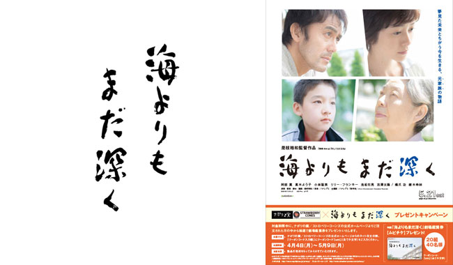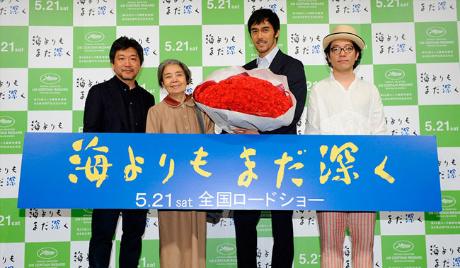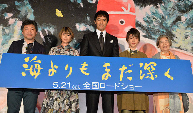 是枝裕和監督コメント 『海よりもまだ深く』の脚本の最初の1ページ目に書いたのは「みんながなりたかった大人になれるわけじゃない」という1行でした。この映画に登場する、 阿部寛さん演じる息子も、樹木希林さん演じる母親も、真木よう子さん演じる別れた元嫁も、みな「こんなはずじゃなかった」という思いを抱きながら、 夢見た未来とは違ってしまった今を生きています。そして、映画の主な舞台になる公団住宅も、建設された当時は思いもしなかったであろう、老人ばかりの現在を生きています。今回の映画は、そんなどうしようもない現実を抱えながらも、夢を諦めることも出来ず、だからこそ幸せを手に出来ないでいる、そんな等身大の人々の今に寄り添ったお話です。なんというか、僕が死んだ後に、神様か閻魔様の前に連れて行かれて、お前は下界で何をしたんだ、と問われたら、真っ先にこの『海よりもまだ深く』を観せると思います。集大成とか、代表作といった言葉がふさわしいわけではないのですが、自分の今を一番色濃く反映出来た作品であることは間違いないです。 良多役 阿部寛さんコメント 今回演じた良多という役は、ある種とてもダメな男。夢を追い続けているけれど、うまくいかず、嫁や子供から見放されてしまった男。こういう役を演じるのは初めてなので、新鮮で楽しい経験でした。〝いつまでも夢を追いかけている人間″の甘えを演じることで、今までにない、面白い人間味を出せたのではないかと思います。実際、僕も10代の頃などは、夢に打ち破れ、それでも何とかやっていくような毎日の連続でした。今回は是枝監督のオリジナル脚本ですが、そういうリアルさも、とても深く描かれている脚本です。 是枝監督の現場は初めてではありませんが、監督は僕らの演技をしっかりと見ていてくださるので、すごく安心感があります。監督の判断にゆだねれば絶対大丈夫だという安心感。作品を最良のものにするための監督の精神は、本当に尊敬しています。今回は、監督が実際に住んでいらっしゃった団地で撮影をしたので、それは今までにない体験でした。監督の小さい頃を知っている方もいらっしゃったので、皆さんすごく温かく盛り上げてくださって。盛り上がりすぎて、撮影できるのかな、っていうくらい(笑)。なんだか、僕まで誇らしい気持ちでした。「帰ってきました!」って。樹木希林さんとの共演に関しては、親子を演じるにあたり、最高の環境を頂いたと思っています。演技の合間に作品のことだけではなく、色々なお話をしてくださって、そういう時間を一緒に過ごすうちに、自然と親子の空気が生まれていきました。樹木さんは、もともとそれを考えて下さったのかな、とも思います。あと、樹木さんだからこそ言えるセリフと言うのがあり、本当に面白いんです。是枝監督が樹木さんにしか言えないセリフを書き、それを「バチーン!!」と演じられる樹木さんがいる。そういう場面が見られる現場は、本当に貴重な経験でした。僕はなぜか強い妻がいる役柄を頂くことが多いのですが、今回、元妻役を演じられた真木よう子さんは、今までにないタイプの強くてドライな女性像を演じてくださったので、僕も今までの役との変化を出せてとても充実していました。男っていうのは、「奥さんが強くてね」と言っているくらいの方が人間味があって魅力的なんですよね。今回僕が演じてた、強がっているのに非常に弱い、そんなダメだけど愛おしい良多を、皆さんに見て頂けたら嬉しいです。 元嫁・響子役 真木よう子さんコメント 是枝組には、不思議な安心感や居心地の良さがあるので、今回も自然でいられる現場でした。監督の脚本は、演じていくとどんどん良さが分かってくるので、樹木さんの一言や、阿部さんの一言などからも発見が多く、とても充実していました。 私が今回演じた響子は、将来を見ている女性です。子供や自分の将来を見据え、それを行動に移せるしっかり者。だから、阿部さんが演じた良多のような、夢見がちな男性が寄ってきてしまうし、反対にそういう男性を好きになってしまうのではないかと思います。阿部さんは色々な作品で拝見していますが、ここまで‘ダメ男’の役は初めてな気がします。でも、すごくハマっていらっしゃいました(笑)。役を演じ分けられる能力がとても高くて素晴らしい俳優さんだなと思いました。 樹木さんとの共演は、なかなかご一緒できる機会もないので、現場で盗めるだけ盗んでやろうと思っていました(笑)。一言一句台本に忠実に演じていらっしゃるのに、樹木さんらしさがキャラクターに滲み出ているのがとても印象的で、改めて尊敬する女優さんだなと感じました。 母・淑子役 樹木希林さんコメント 背が高すぎて苦労した時代が長かった阿部さん、ローマ風呂だけじゃない居場所を見つけたのね。あの時代は憧れだった団地、70過ぎた婆さんにとってエレベーターのない団地の撮影はヨッコ