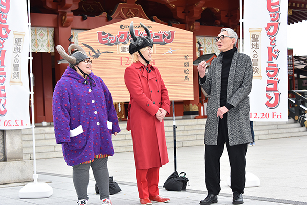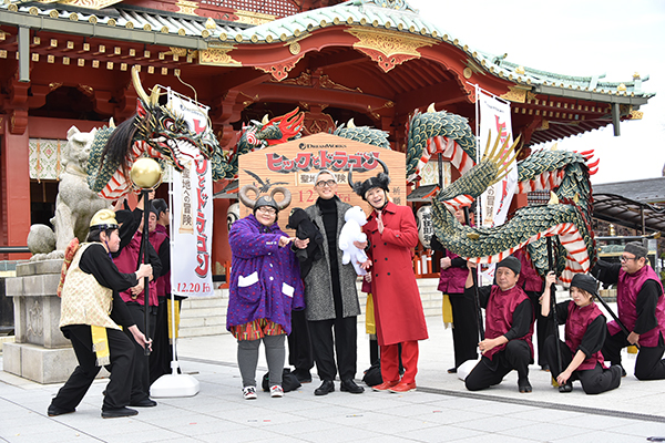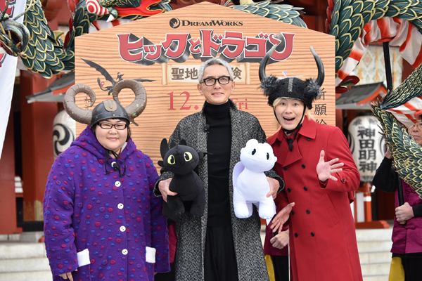 『ヒックとドラゴン 聖地への冒険』公開を直前に控え、主人公ヒックとトゥースを脅かす最凶のドラゴンハンター“グリメル”役のボイスキャストを務めた松重豊さん、シリーズファンであり最強のお笑いコンビ・メイプル超合金のカズレーザーさん、安藤なつさんにご登壇頂き、大ヒット祈願イベントを神田明神にて実施いたしました!