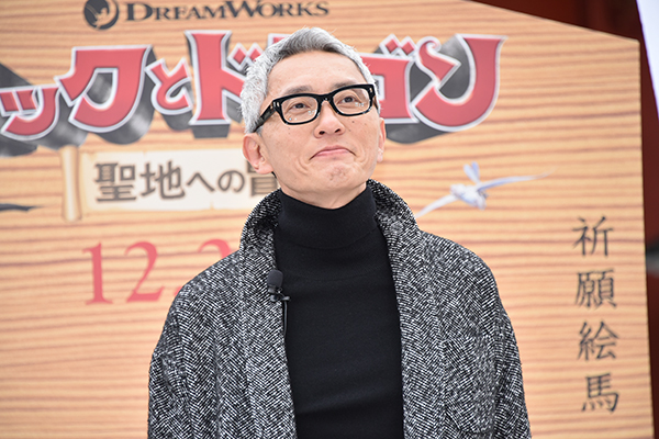 2人の登場に苦笑いの松重さんでしたが、「龍踊しかり、世の中にいるわけがないドラゴンという生き物が、世界共通のイメージを持って息づいているのが面白いです」と『ヒックとドラゴン』シリーズに絡め、冷静にコメント。最後には、「自分が声を当てていることを忘れるくらい物語に没入したし、どこから切り取っても味わいがあり、CG技術も凄くて画がクリア。キャラクターの動きも役者がやるよりリアルで僕らも失業の危機を感じます…!」と会場から笑いを取りつつ作品をアピール。イベント終盤には、3人で巨大絵馬にそれぞれの願いを書き込んで貰い、和やかな雰囲気で大ヒット祈願イベントは終了しました!