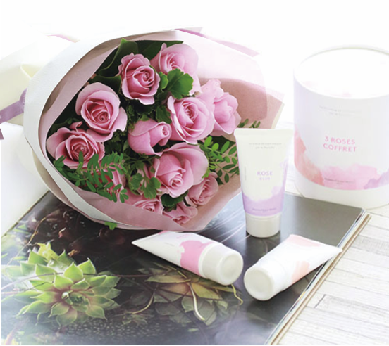 映画のシーンにぴったり合うような、ダズンローズブーケ(ペシュ)と、バラの香りに特化した3種のハンドクリームセットです。