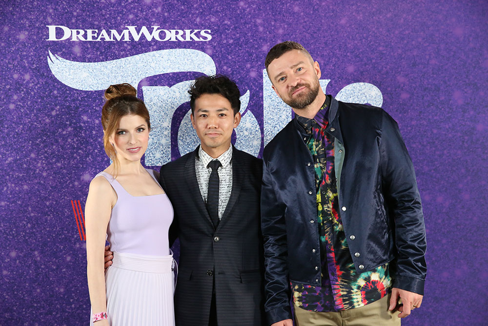本作の主人公ポピー役のアナ・ケンドリック、ブランチ役のジャスティン・ティンバーレイク、監督のウォルト・ドーンににインタビューをするという重大任務を敢行した綾部氏。