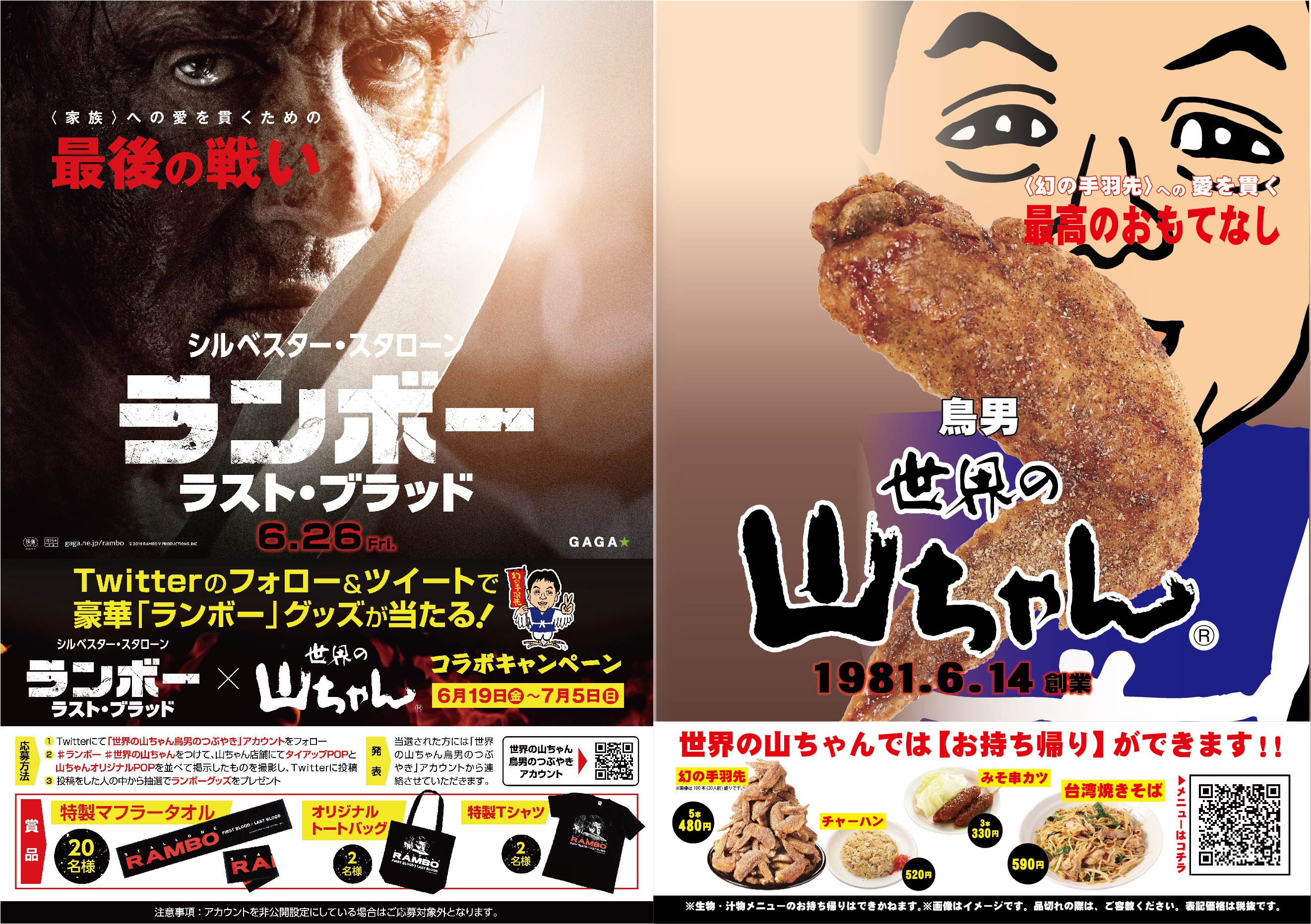 - ②「#ランボー」「#世界の山ちゃん」を付けて、山ちゃん店舗にてタイアップPOPと山ちゃんオリジナルPOPを並べて掲示したものを撮影し、twitterに投稿