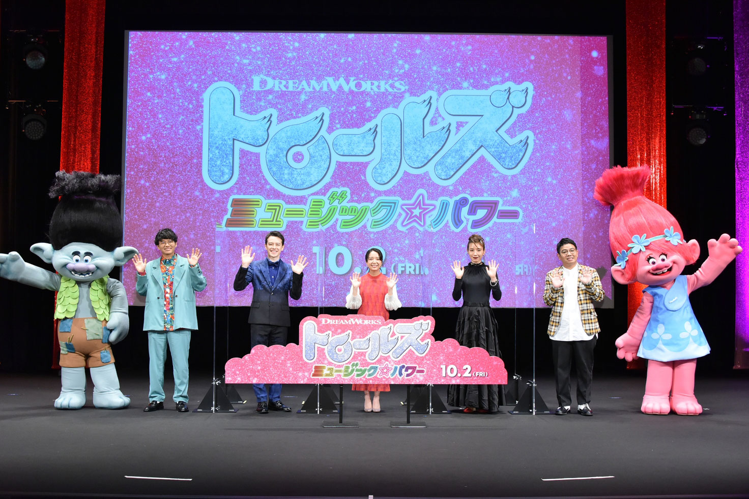 主人公ポピー役を演じる上白石萌音さん、ポピーの親友、ブランチ役のウエンツ瑛士さん、ロック村の女王・バーブ役の仲里依紗さん、トロール王国のひとつ「クラシック・トロール」の指揮者、トロールツァルト役のミキ・昴生さん、ポピーと同じ「ポップ・トロール」の仲間であるクラウド・ガイ役のミキ・亜生さんが登壇する完成披露イベントが開催されました。イベントでは上白石さん、ウエンツさん、仲さん、ミキさんが本作の声優を務めた感想や裏話などを語り合い、さらに今回、『トロールズ ミュージック★パワー』の劇中で使用されている「Trolls Wanna Have Good Times」と「Just Sing」の二曲からによる、「トロールズ ミュージック★パワー スペシャルメドレー」を、キャスト5名で歌い上げるライブパフォーマンスも披露!