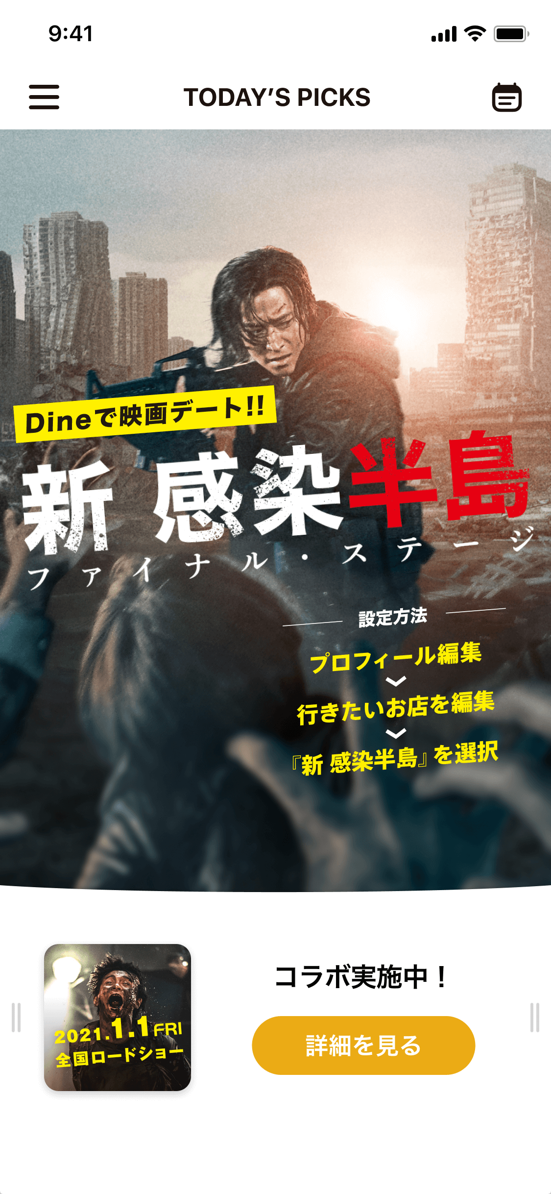映画『新 感染半島 ファイナルステージ』と「dine」が思い出に残るデートを演出します。