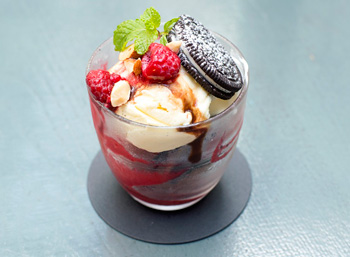 バニラビーンズたっぷりの濃厚なバニラアイスとチョコレートアイスにラズベリーを合わせました。