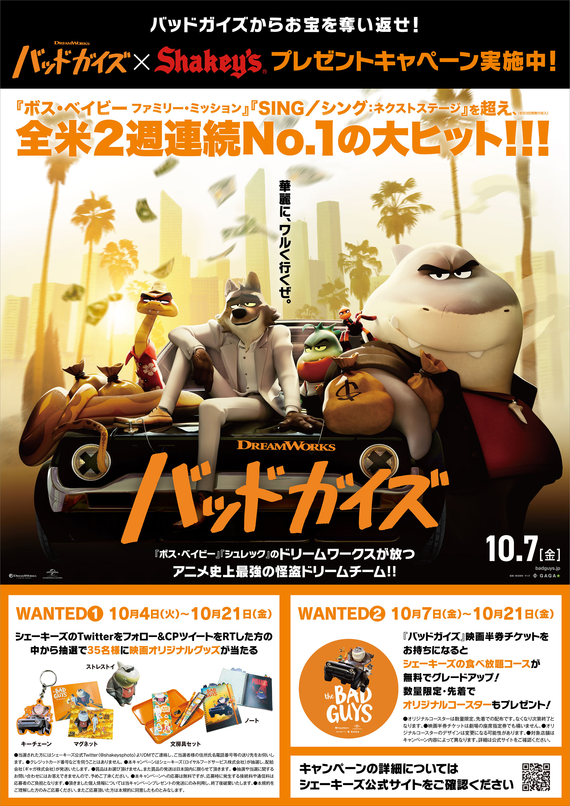 映画『バッドガイズ』の映画半券チケットをシェーキーズの店舗にお持ちになると、食べ放題コースが無料でグレードアップ!