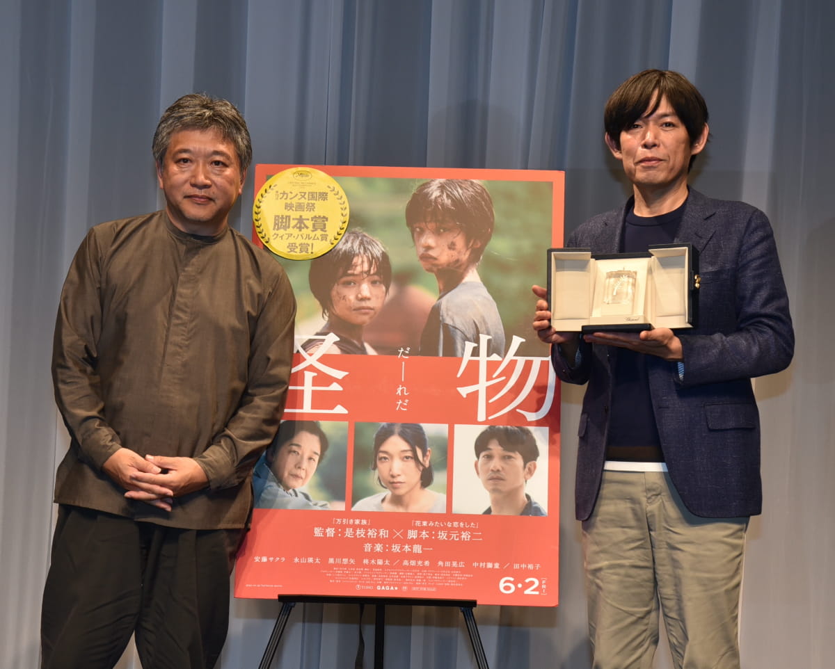 会見冒頭では、監督より坂元にカンヌより持ち帰った脚本賞のトロフィーが直接手渡され、