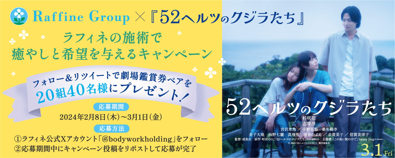 ラフィネ公式Xアカウント@bodyworkholdingをフォローして キャンペーン投稿をリポストすると、劇場鑑賞券を抽選でペア20組40名様にプレゼント! 【実施期間:2024年2月8日~3月1日】