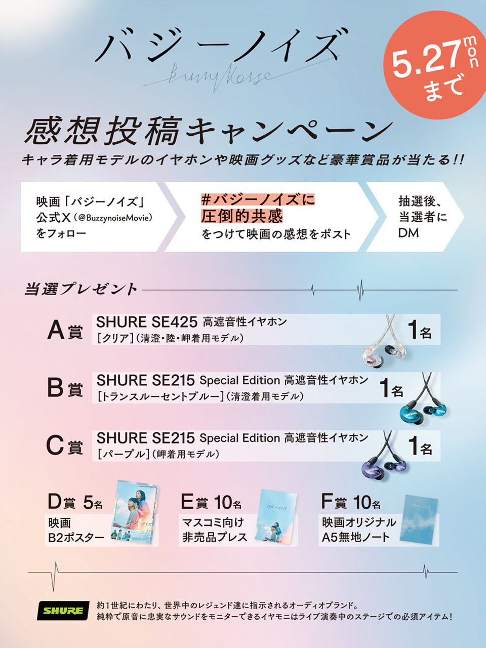 キャラ着用モデルのイヤホンや映画グッズなど豪華賞品が当たる、感想投稿キャンペーンをXにて実施いたします。奮って、ご応募ください。