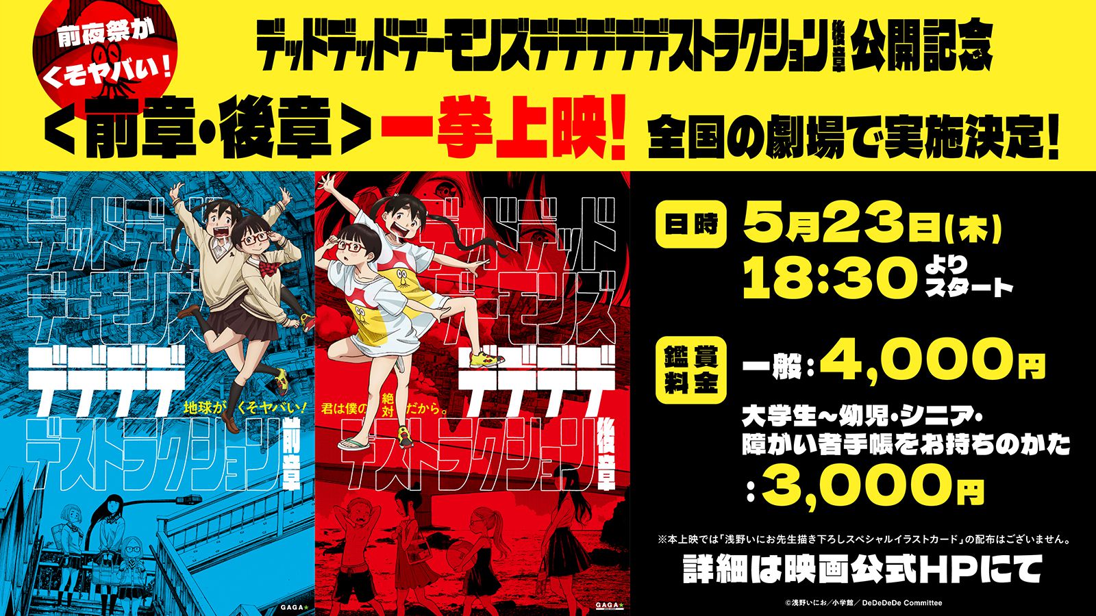 『デッドデッドデーモンズデデデデデストラクション 後章』の公開前夜となる5月23日(木)に、前章と後章を続けて鑑賞できる一挙上映を、全国の劇場で実施することが決定しました。