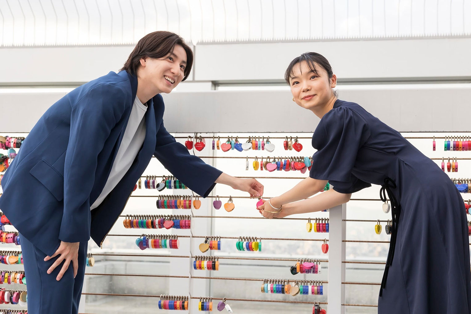 大阪の街並みが一望できる恋人たちの聖地 梅田スカイビルの「空中庭園」で、京本大我と古川琴音が参加し、『言えない秘密』のヒット祈願イベントを実施しました。