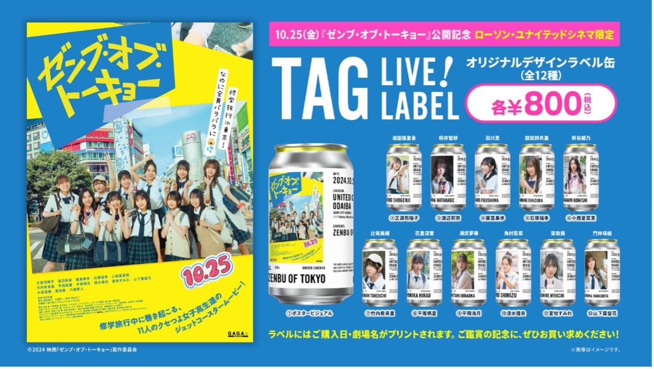映画『ゼンブ・オブ・トーキョー』公開を記念して、本作のポスタービジュアルと「日向坂46」四期生メンバー11名それぞれの【オリジナルデザインラベル缶≪TAG LIVE! LABEL≫】を10月25日(金)より全国8館のローソン・ユナイテッドシネマ グループの飲食売店で販売開始します!