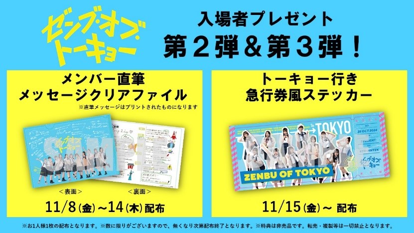 そして、11月15日(金)から配布となる第3弾入場者プレゼントは、「トーキョー行き急行券風ステッカー」。メンバーそれぞれ個性際立つポーズがキュートな急行券風ステッカーは、お気に入りのアイテムに貼るも良し!ゼンブ・オブ・トーキョーの世界に浸れるアイテムとなっている。第2弾、第3弾どちらも数量限定となり超貴重です!ぜひゲットしてください。