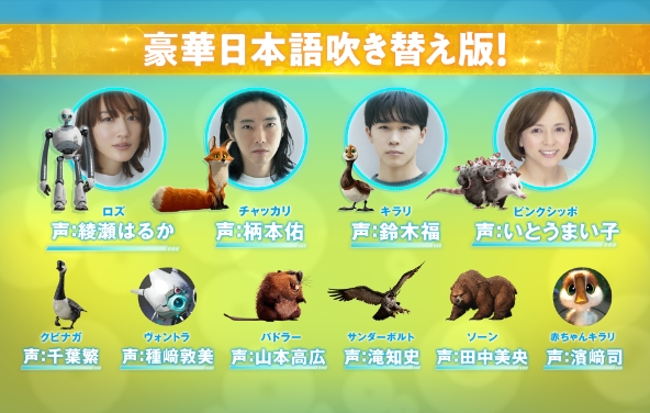 さらに、渡り鳥のリーダーであるクビナガ役を千葉繁さん(「ONE PIECE」バギー役など)、ロズを回収するために島へやってくるロボットのヴォントラ役を種﨑敦美さん(「SPY×FAMILY」アーニャ・フォージャー役など)、不機嫌で引っ込み思案なビーバーのパドラー役を山本高広さん(「逃げ上手の若君」市河助房 役など)、島の野生動物界の頂点に君臨するクマのソーン役に田中美央さん(「怪獣8号」乃木坂 十蔵役など)、といった豪華声優陣が脇を固めている。