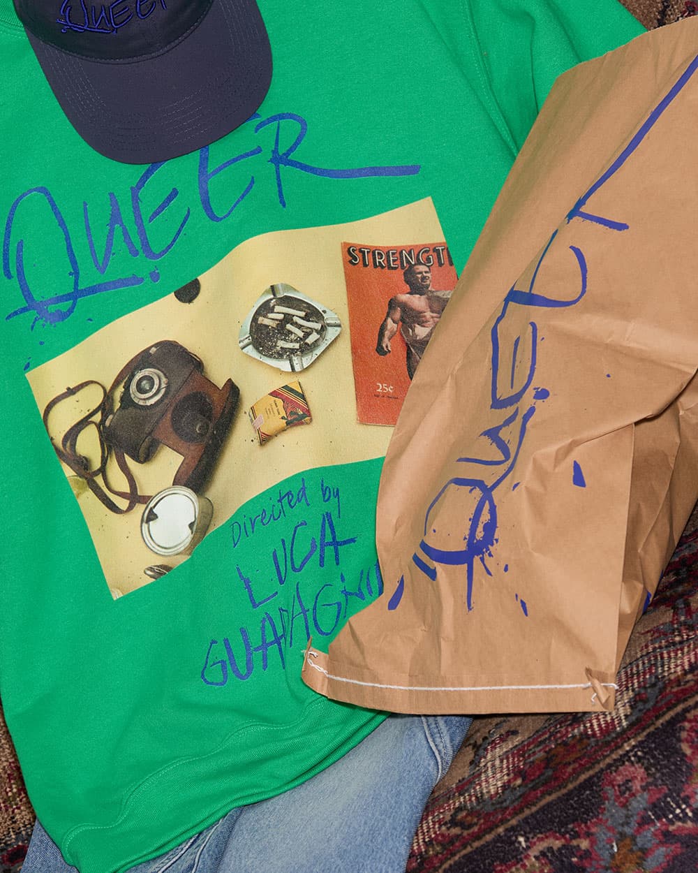 コレクションでは、映画のポスターやメインビジュアル、そして『クィア/QUEER』のテーマに基づいたグラフィックをウェアやアクセサリーに落とし込まれています。「QUEER」の文字はグレーのフーディーにプリントされ、ビーズで装飾されたドローストリングは映画を彩る要素と調和。フーディーの背面には「I want to talk to you… without speaking(言葉を使わずに、あなたに話しかけたい)」という台詞がプリントされています。さらに、公式ポスターのデザインを彷彿とさせる映画タイトルとクレジットがあしらわれたグレーのクルーネックスウェットや、映画からインスパイアされた印象的なビジュアルがプリントされた鮮やかなグリーンのスウェットシャツも展開。またスチールブルーのTシャツには映画タイトルを、グレーメランジのTシャツには映画の中で変身の象徴として登場する、ムカデのネックレスを模したデザインを取り入れました。