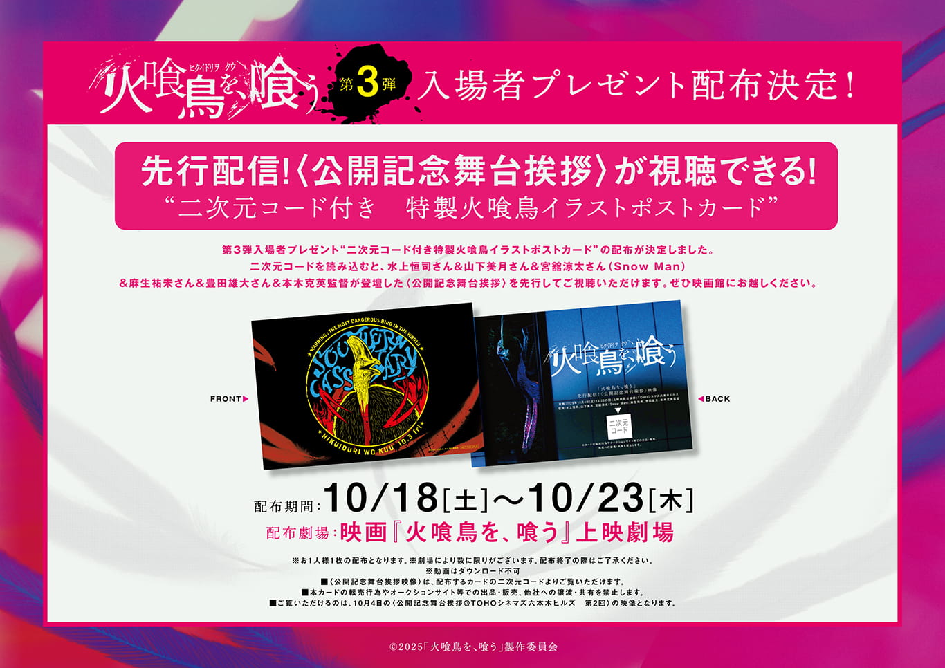 10月18日(土)から6日間限定で、入場者プレゼント「先行配信『火喰鳥を、喰う』<公開記念舞台挨拶>映像が観られる!二次元コード付き特製火喰鳥イラストポストカード」の配布が決定いたしました!