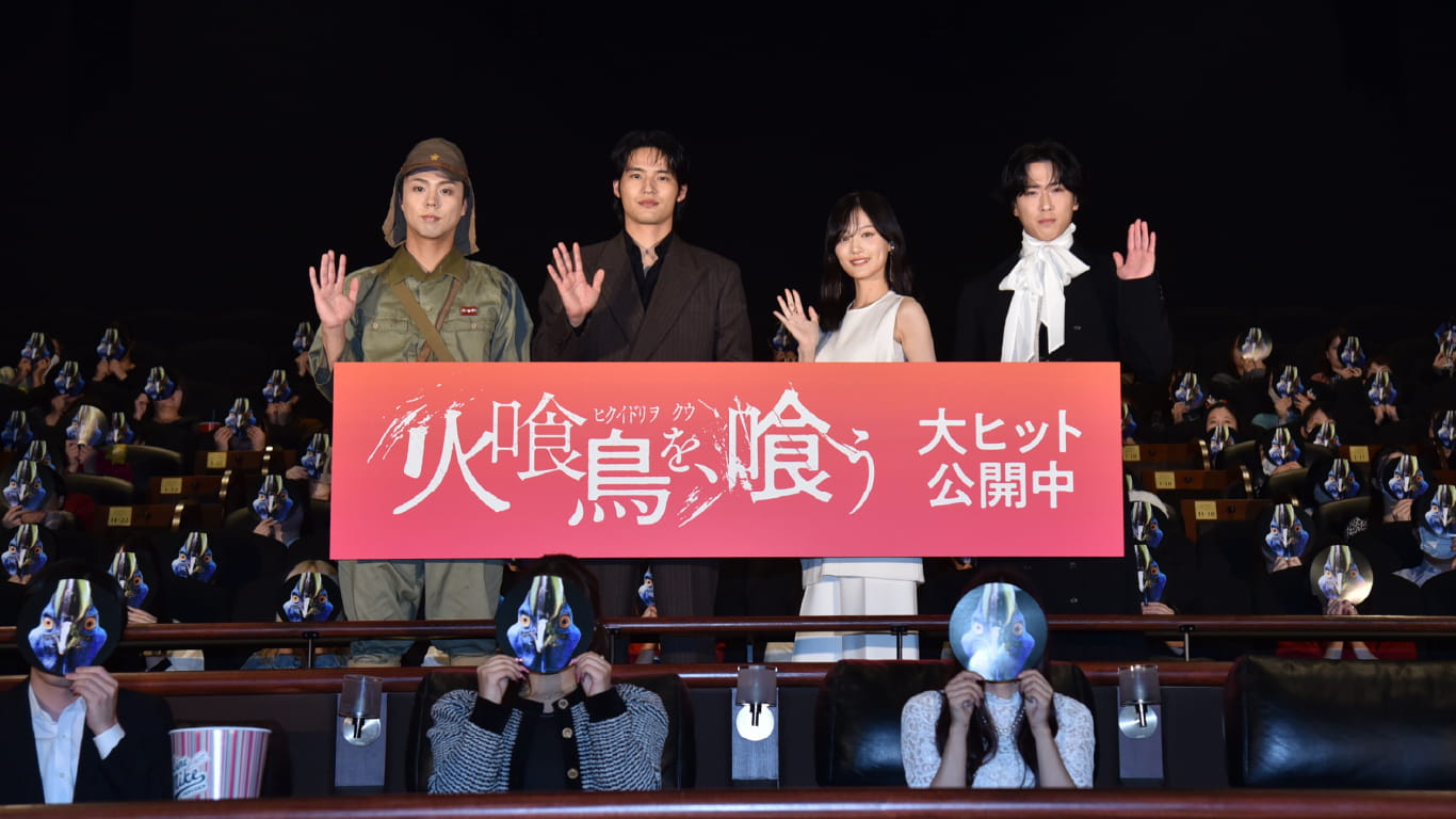 映画『火喰鳥を、喰う』の大ヒット御礼舞台挨拶が10月16日(木)、東京・六本木のTOHOシネマズ 六本木ヒルズにて開催され、水上恒司、山下美月、宮舘涼太(Snow Man)が登壇。さらにイベント終盤にはサプライズで、物語のカギを握る重要人物・貞市を演じた小野塚勇人が役衣装の軍服姿で来場し、会場は大きな盛り上がりを見せた。