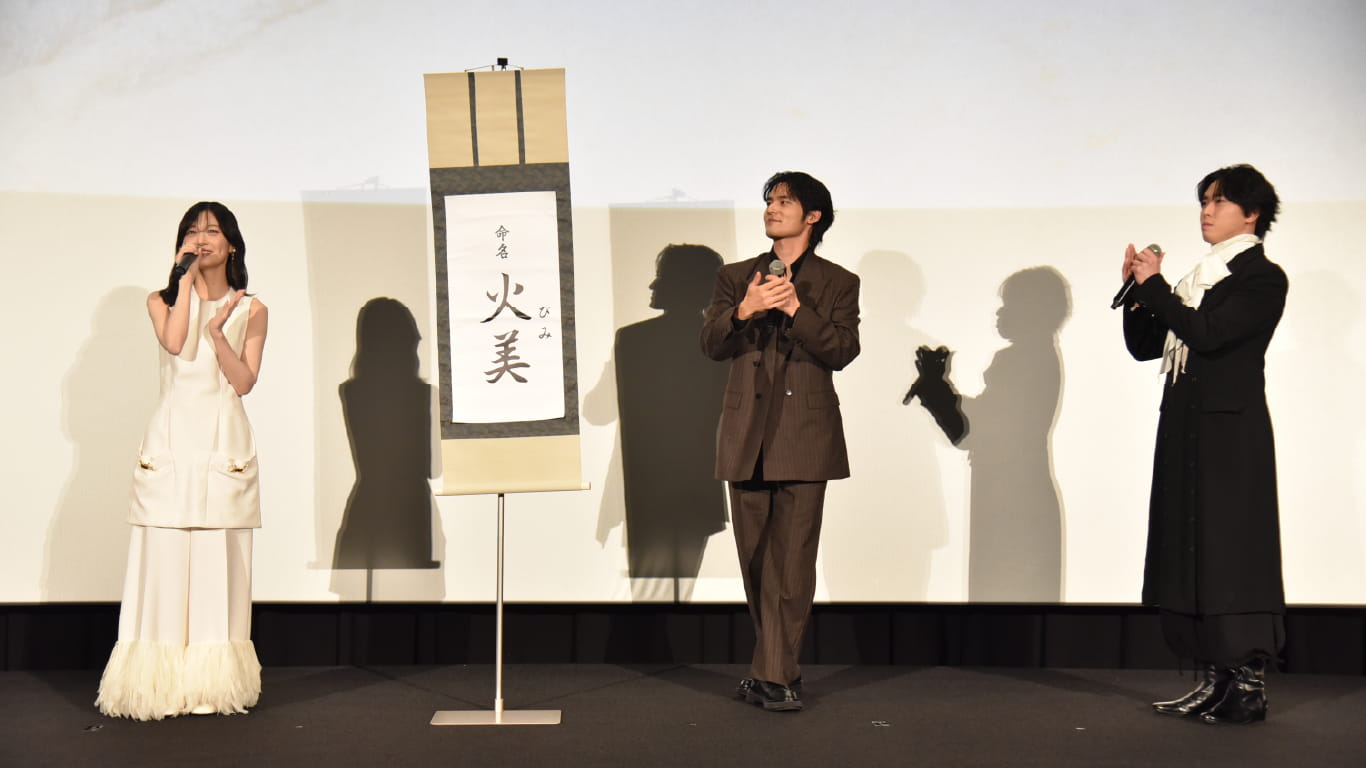 ドラムロールに合わせて、水上さんが紐を引いて開いた掛け軸に書かれた名前は「火美(ビミ)」。宮舘さんは「“火”に“美しい”で火美(ビミ)!新しいですね」とニッコリ。水上さんは「たぶん、映画の中で『ビミ』という言葉を舘さんが一番言っていると思います」と指摘し、宮舘さんも「ふさわしいお名前ですし、映画の内容もくみ取っていただけたのかなって思います」とうなずく。水上さんは「40歳の妖艶な感じが…」と印象を語り、山下さんが「熟女って感じ(笑)!」とまたもストレートに感想を口にし盛り上がりつつ、3人は「火美ちゃん、おめでとう!」と火美ちゃんを祝福していた。