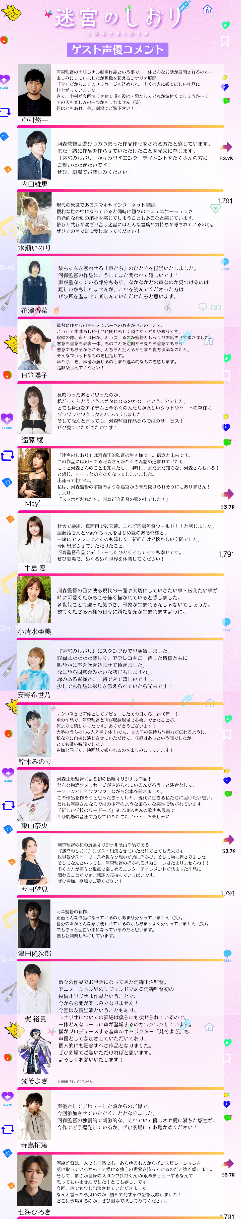 各キャストからのコメントも到着し、それぞれが語る『迷宮のしおり』の魅力、そして河森監督ワールドの魅力にますます期待がふくらみます!