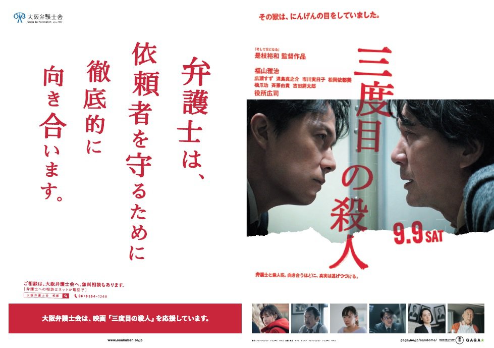 このポスターでは、福山雅治さんと役所広司さんが向き合う構図になっている映画のポスターの横に、同じタッチで「弁護士は,依頼者を守るために徹底的に向き合います」というコピーが書かれた大阪弁護士会のポスターを並べ、映画の広告と合わせて、弁護士が依頼者の権利を守る役割を果たすということを効果的に広報したコラボポスターになっています。