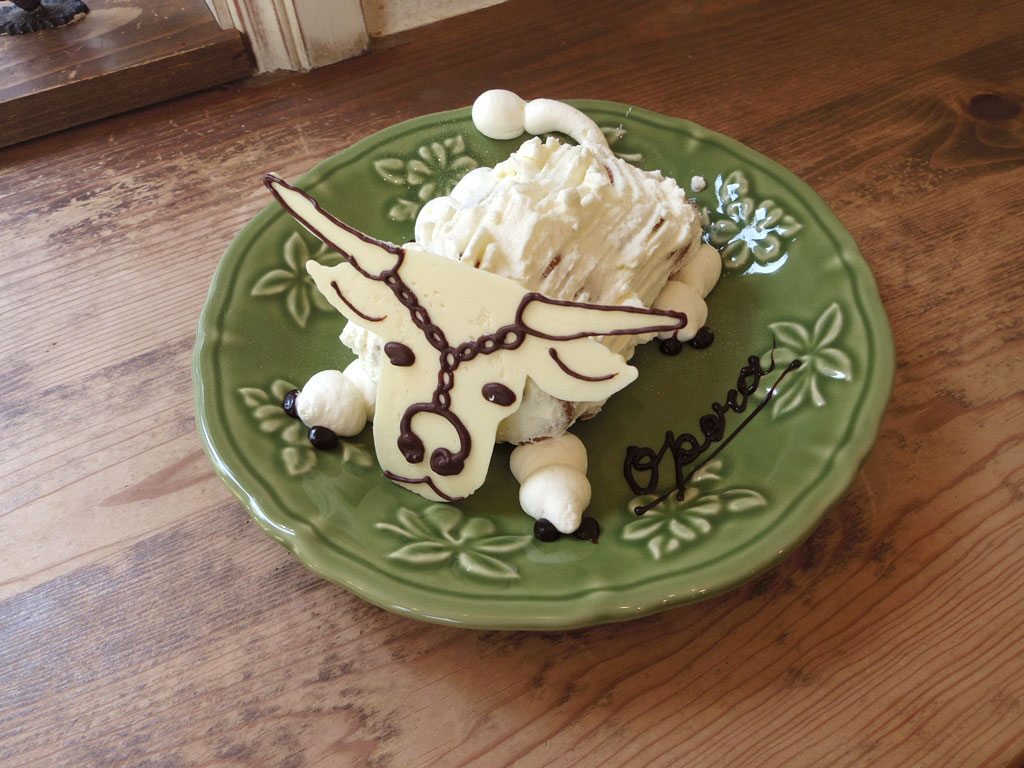 バナナとチョコレートソースを巻いたクレープを生クリームでコーティングし、牛の顔のホワイトチョコレートを飾りました。