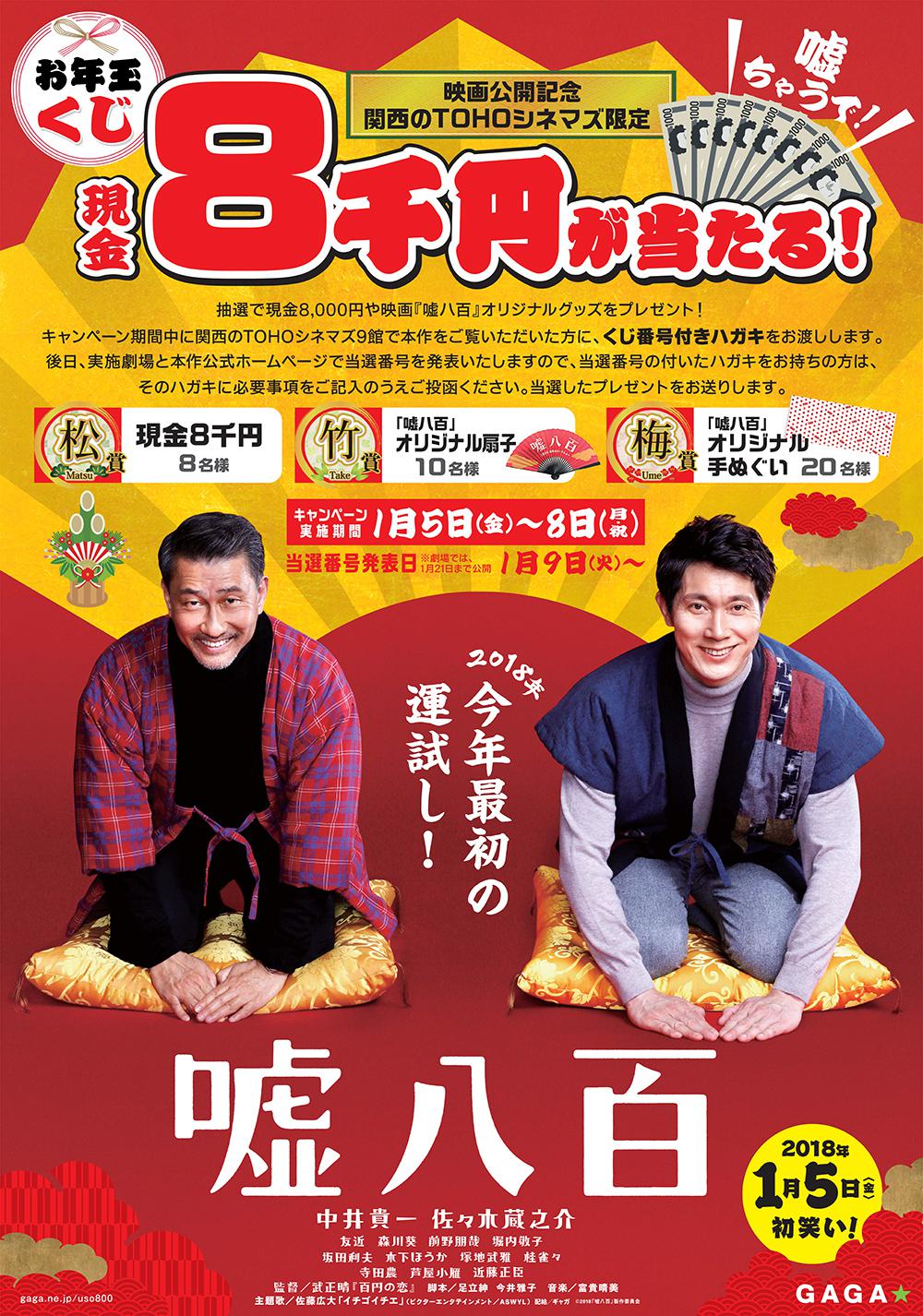1月5日(金)~8日(月・祝)の公開期間中、関西のTOHOシネマズ9劇場(※下記参照)にて、本作をご鑑賞のお客様に抽選で現金や映画オリジナルグッズが当たるお年玉くじを配布します。