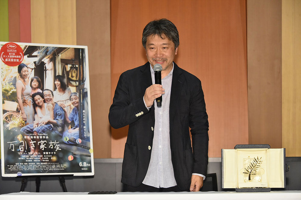 会見場には夜遅い時間にも関わらず、約80名のマスコミが詰めかけ、黄金に輝く“パルムドール”のトロフィーとともに登場した是枝監督に次々と質問が飛び、是枝監督は自身初のパルムドール受賞の感想をはじめ、公開間近の本作に込めた熱い思いを語りました。