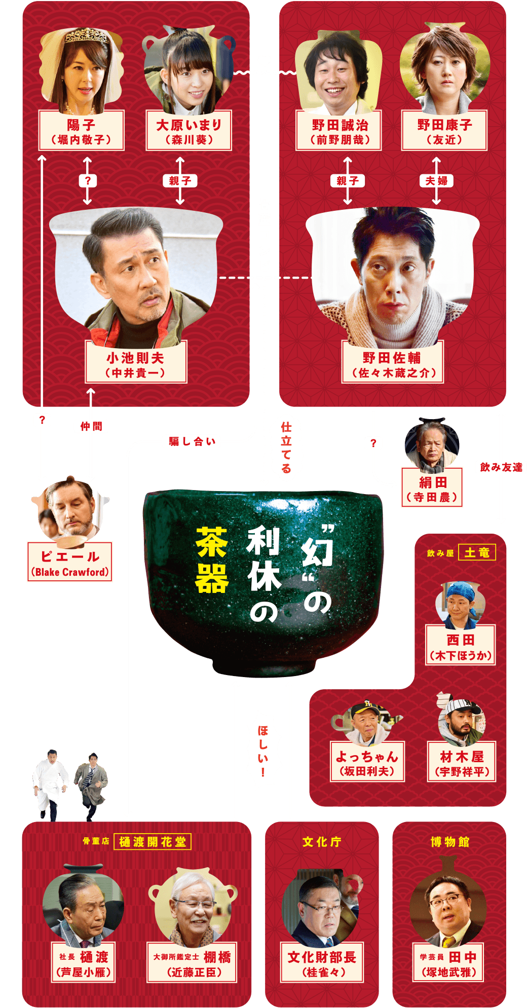 大物狙いで空振りばかりの目利き古物商を演じるのは中井貴一。腕は立つのに落ちぶれくすぶる陶芸家を演じるのは佐々木蔵之介。何の因果か堺で出逢ったふたりは、自分たちの不遇のきっかけを作った共通の敵に仕返ししようと大勝負を仕掛ける。「凄い初共演が残っていた!」とスタッフ全員が驚いた強力タッグ!中井と佐々木の本格的な共演はこれが初となった。