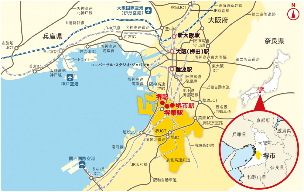 関西の中央部に位置し、面積149.82平方キロメートル、人口83万人を有する政令指定都市。南大阪の中核的都市として発展。堺ゆかりの人には、茶道を大成したわび茶の祖・千利休や、明治から昭和を短歌とともに生きた情熱の歌人・与謝野晶子などがいる。劇中でも登場する「さかい利晶の杜」では、2人にまつわる展示や映像なども楽しめる。世界最大級の墳墓である仁徳天皇陵古墳をはじめとする百舌鳥・古市古墳群の世界文化遺産登録を目指した国内推薦も決定し、国内外から注目を集める。