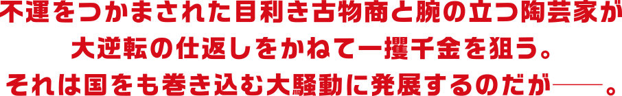 あの千利休の幻の茶器が、茶の湯の聖地で発見された。その真贋や、鑑定額や、いかに─?! 日本中を沸かせる世紀の骨董ロマンが、2018年の笑い初めにふさわしい「開運!お宝コメディ」になった。この茶器を巡って大騒動を巻き起こすのは、日本映画界を代表する俳優、中井貴一と佐々木蔵之介。いずれも人気実力ともに抜群で、ジャンルを問わない演技派だが、中井貴一は『グッドモーニングショー』、佐々木蔵之介は『超高速!参勤交代』『超高速!参勤交代 リターンズ』とヒットを飛ばしたコメディ映画主演の記憶が新しい。その二人が満を持しての本格共演。騙し騙されつつの出会いから、一世一代の大芝居を打つ痛快コンビの結成まで、がっぷり四つの丁々発止が見逃せない。脇を固めるのは友近、森川葵、前野朋哉、堀内敬子、坂田利夫、木下ほうか、塚地武雅、桂雀々、寺田農、芦屋小雁、近藤正臣らひと癖もふた癖もある超個性派俳優陣。芸達者たちのトボけたやりとりや愉快なてんやわんやに大笑い。大人による大人のためのコメディ映画が誕生した。