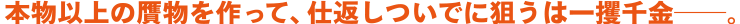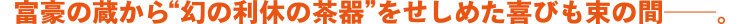 利休形見の茶器の本物の〈譲り状〉と〈箱〉はある。だが、肝心の〈茶器〉がない。則夫は一瞬でも自分の目を惑わせた佐輔の腕を見込み、一世一代の大勝負を持ちかける。「悔しかったら、やり返せよ」。実は則夫自身にも樋渡と棚橋に一杯食わされた過去があった。